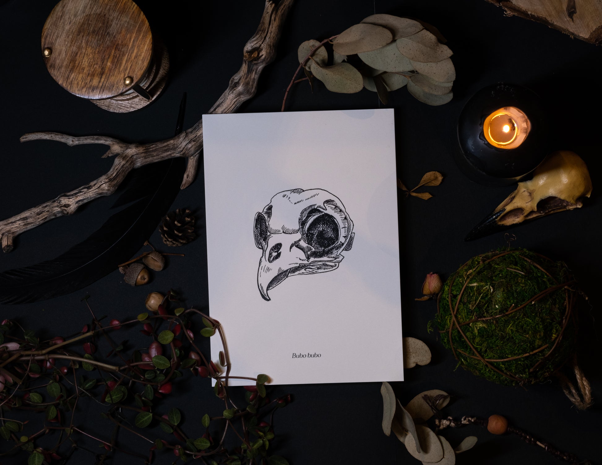 Illustration depicting the skull of the Eurasian Eagle Owl made with pen and ink.